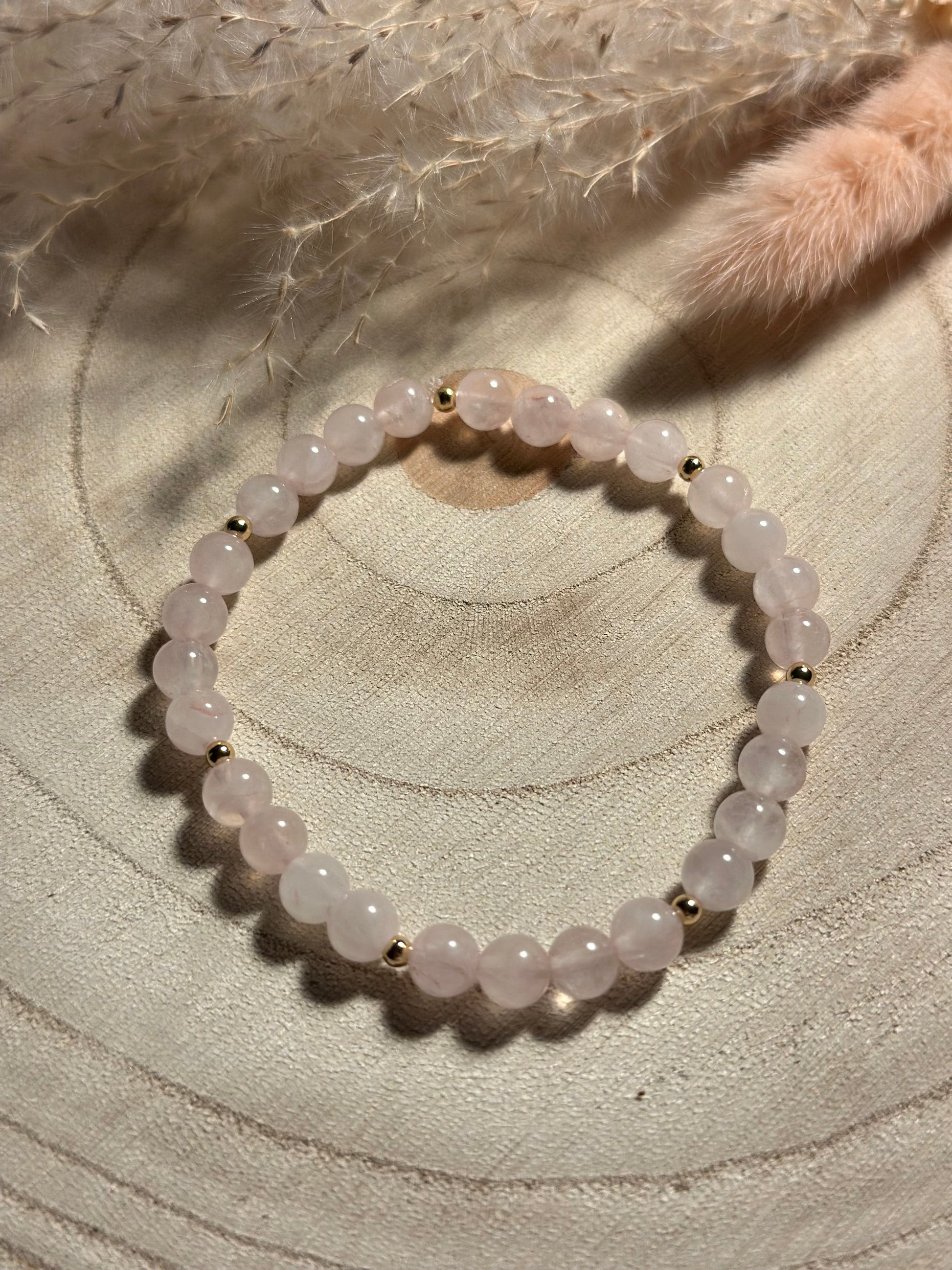 Handgemachtes Armband mit Rosenquarz Perlen und goldfarbenen Akzenten